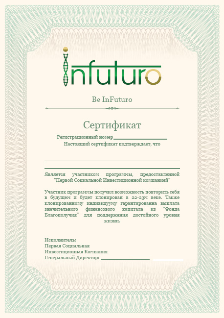 Приобретая сертификат INFUTURO, вы получаете действительную возможность повторить себя/другого человека в будущем. В середине XXII века компания «ПСК-инвест» приступит к процессам воспроизведения по предоставленным Вами образцам в порядке очередности.