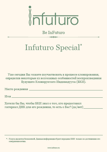 Мы планируем, что к середине XXII века начнутся операции по клонированию. Из образцов ДНК воспроизведут здоровых, уже когда-то существовавших людей. На их лицевом счете из Фонда Благополучия к тому моменту накопится приличный капитал. По достижении совершеннолетия, помимо наследства, потомок может получить Ваше личное послание, при условии Вашего участия в бонусной программе INFUTURO SPECIAL. Для этого Вы должны заполнить бланк-вопросник, предоставляемый Вам безусловно и бесплатно в качестве бонуса в наборе INFUTURO. Уже сегодня Вы можете определить будущее имя и место рождения клонируемого, а также предоставить информацию о себе. | |